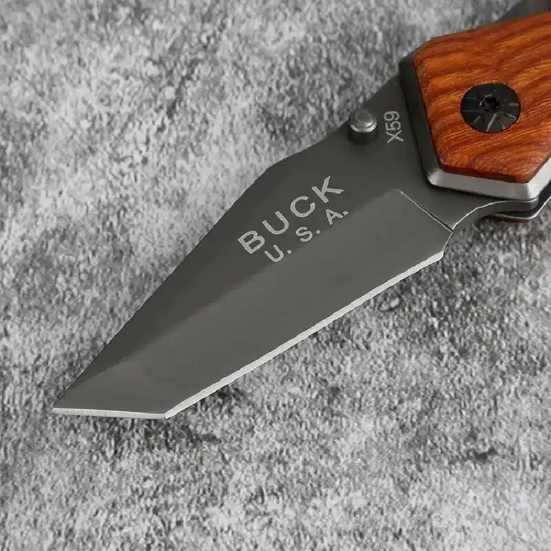 سطح تیغه با پرداخت مات و لوگوی حکشدهی BUCK U.S.A. جلوهای حرفهای و کلاسیک به محصول داده است.